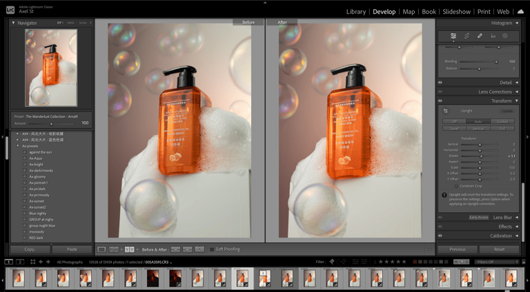 To kick off the editing process, I uploaded the picture to Lightroom, where I applied my basic coloring preset to set the tone for the final look. This preset helps establish the foundational mood of the image with consistent colors and lighting. Next, I made minor adjustments to the angle and cropped the photo to refine the composition. This quick setup in Lightroom ensures the image is perfectly framed and ready for the detailed edits in Photoshop